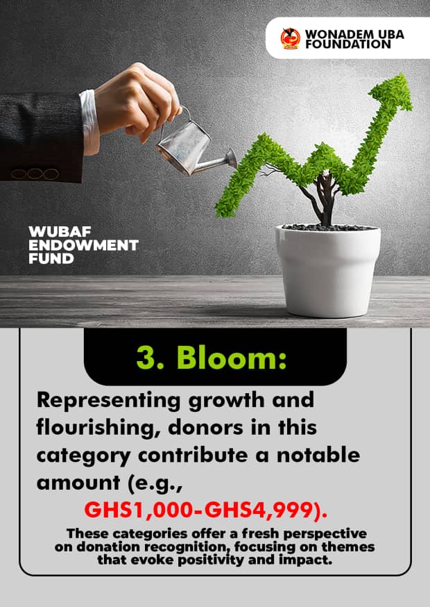 Bloom: Representing growth and flourishing, and donors in this category contribute a notable amount (GHS1,a notable amount (GHS1,000.00-GHS4,999.00).