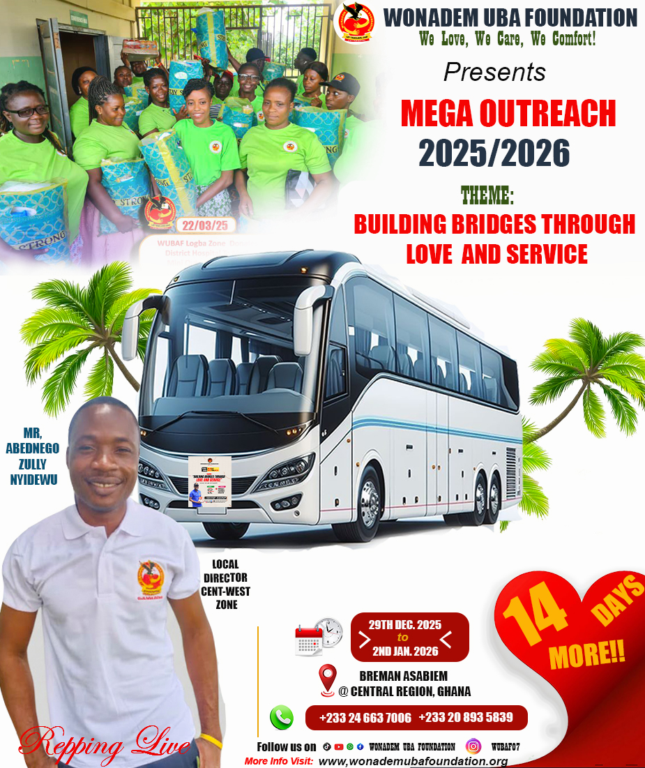 The Wonadem UBA Foundation is hosting an outreach program, "Building Bridges Through Love and Service," from Dec 29, 2025, to Jan 2, 2026, in Breman Asabiem, a rural community in Ghana's Central Region. The program aims to provide essential services, promote social cohesion, and demonstrate love and care through initiatives in education, healthcare, community development, and skill training.