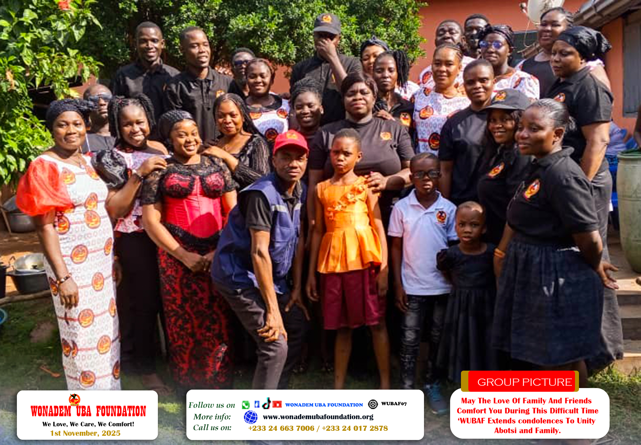 In a heartwarming display of love, care, and compassion, Wonadem UBA Foundation (WUBAF) attended the burial service of Unity Abotsi's father at Leklebi Duga in the Volta Region. The members, hailing from various parts of Ghana, converged at the funeral ground on November 1, 2025, between 8:00 am and 9:00 am, to pay their respects and offer support to their beloved member during this difficult period.