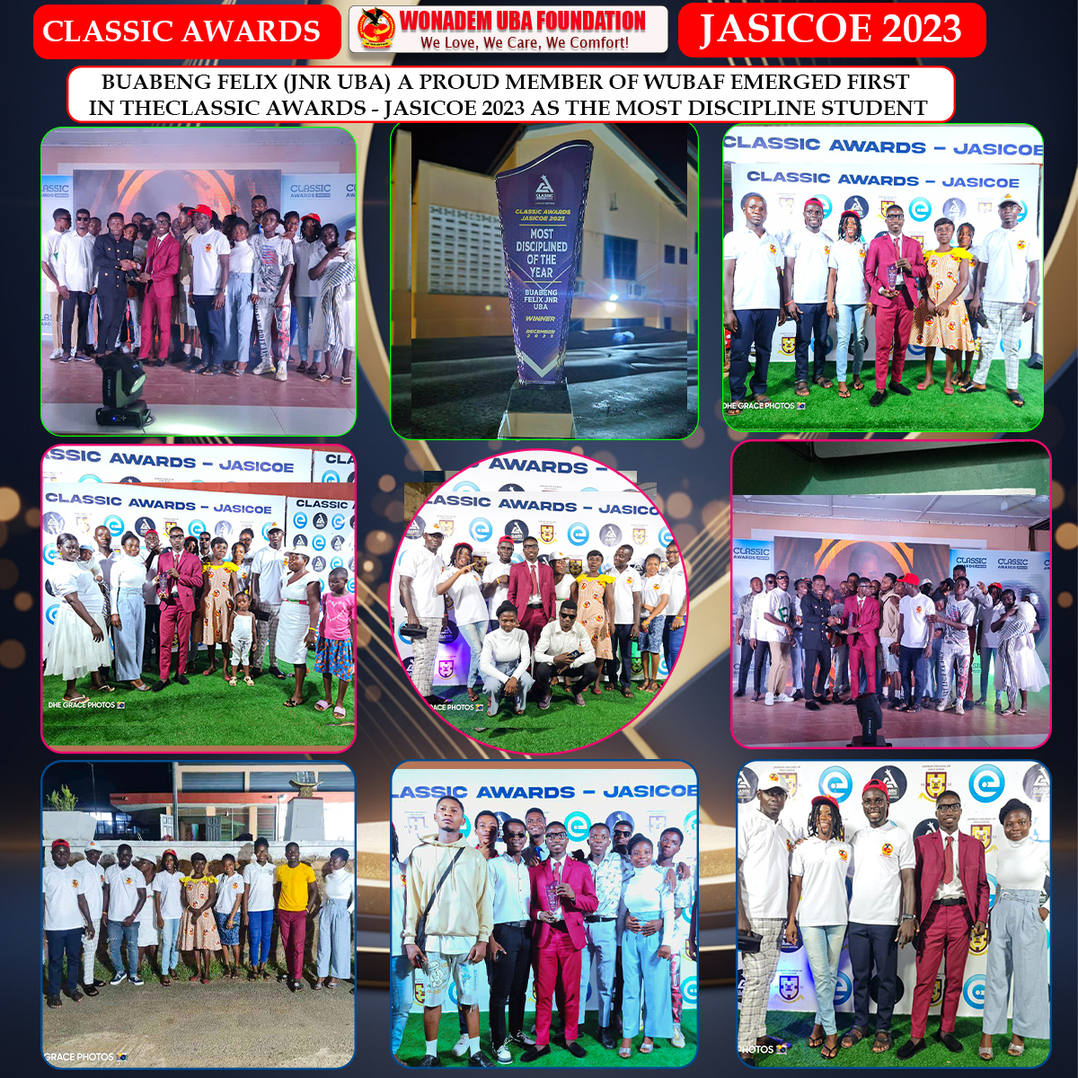 Buabeng Felix JNR UBA, a proud member of Wonadem UBA Foundation (WUBAF), has made his mark by emerging first in the Classic Awards - JASICOE 2023 as the most disciplined student of the year. This achievement is a testament to his hard work, dedication, and the values instilled in him by WUBAF.