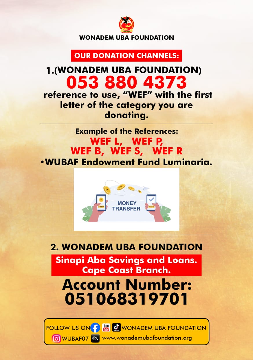 WONADEM UBA FOUNDATION , OUR DONATION CHANNELS: 1.(WONADEM UBA FOUNDATION) 053 880 4373 referen...