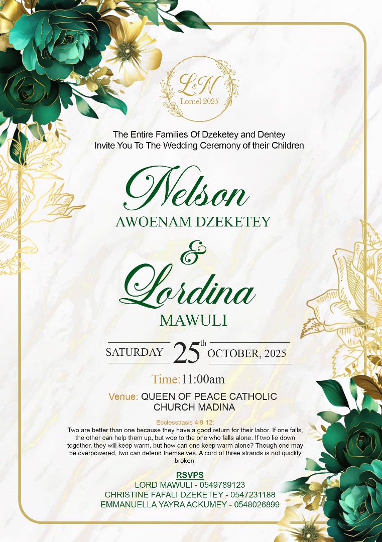 We are delighted to announce the upcoming wedding ceremony of our dear brother, Nelson Awoenam Dzeketey, and our beloved sister, Lordina Mawuli.