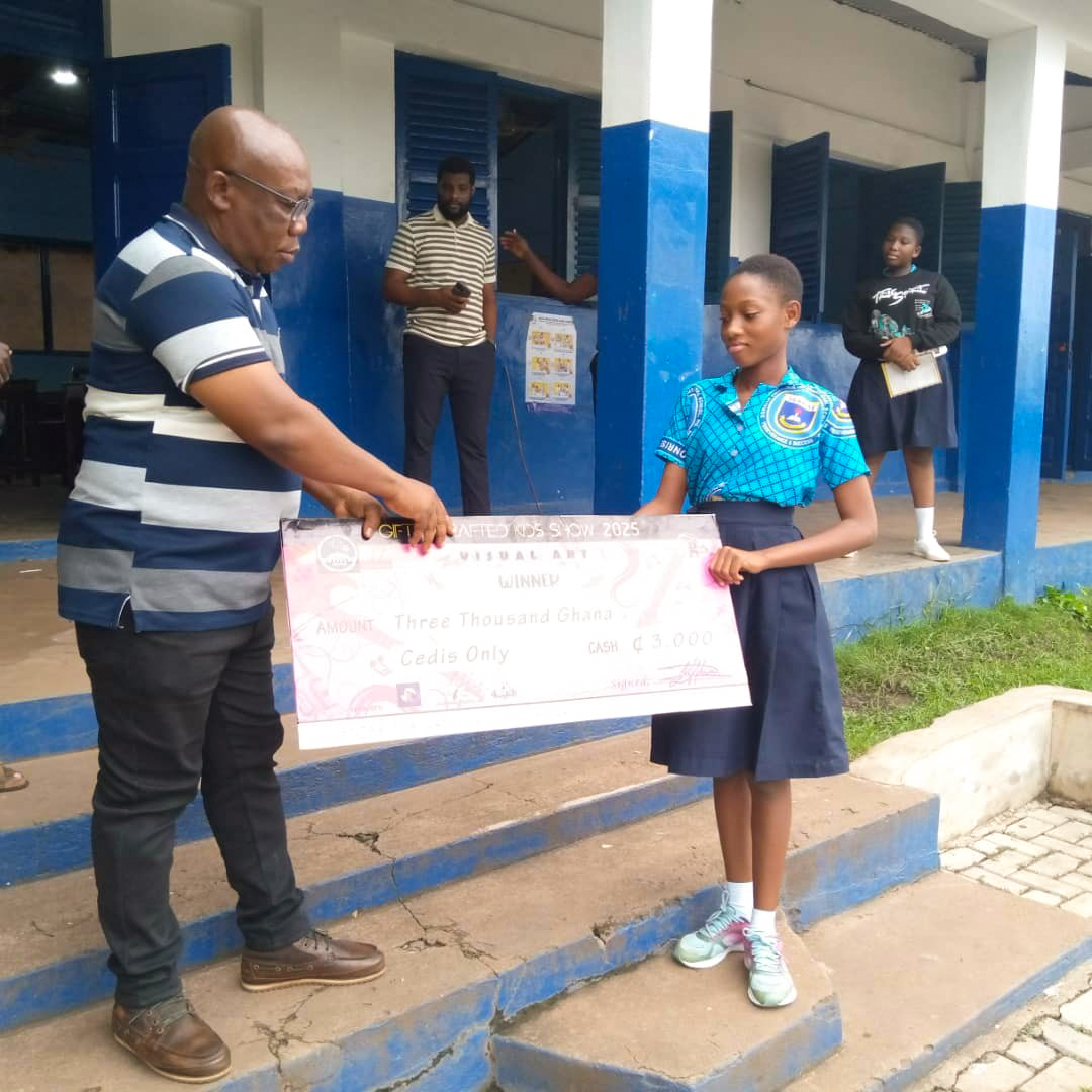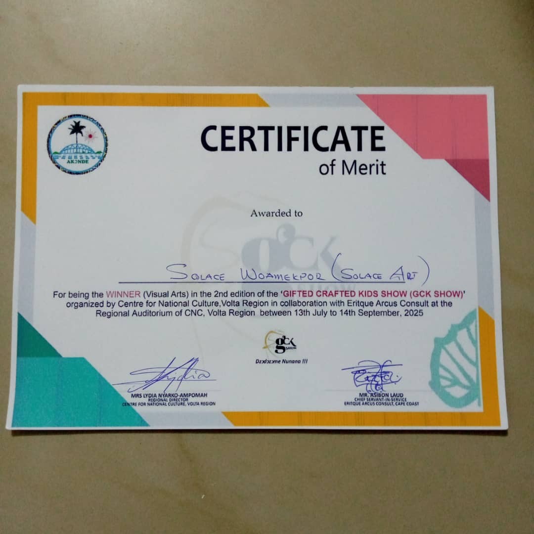 Solace Woamekpor, a proud member of Wonadem UBA Foundation (WUBAF), has made her mark in the art world by emerging first in the Visual Art category at the 2nd Edition of the Gifted Crafted Kids (GCK) show 2025. This talented young girl's achievement is a testament to her creativity and dedication to her craft.